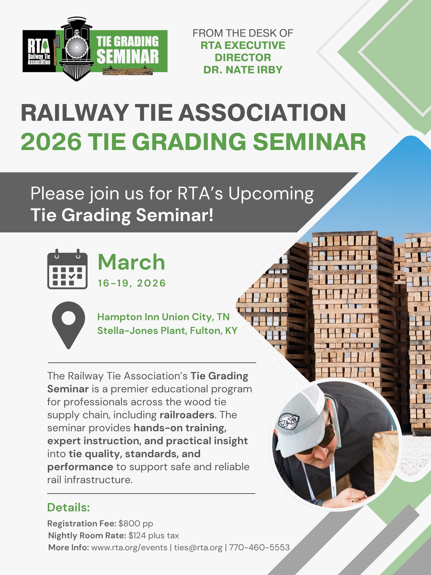 This year's Tie Grading Seminar is hosted by Stella-Jones Corp., with on-site instruction taking place at the Fulton, Kentucky, plant. Classroom instruction will be held at the Hampton Inn in Union City, Tennessee.